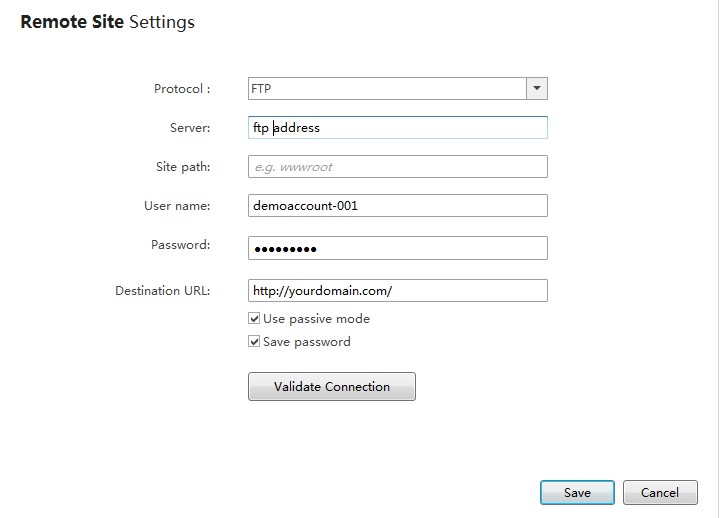 - Username: Your FTP username, eg, demoaccount-001