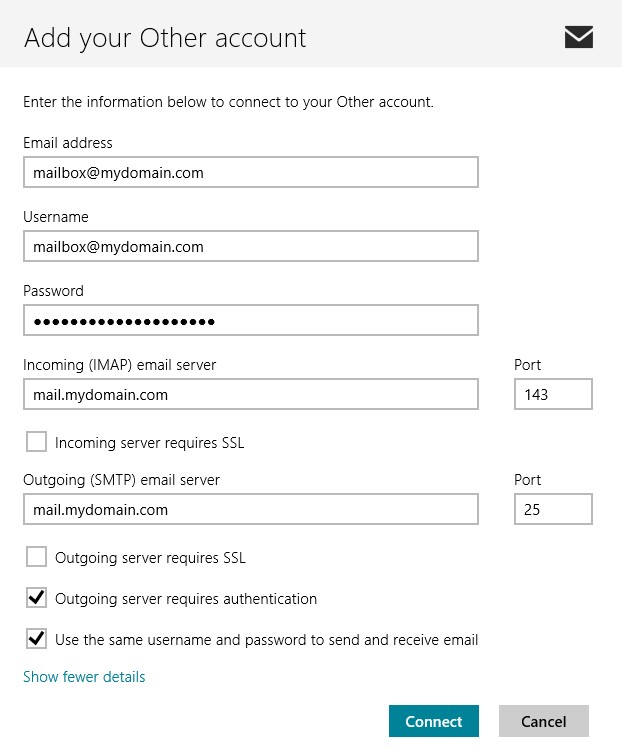 Follow the steps below to set up Windows 8 Mail to retrieve and send email from our mail server. (Replace "mydomain.com" with your actual domain name.)