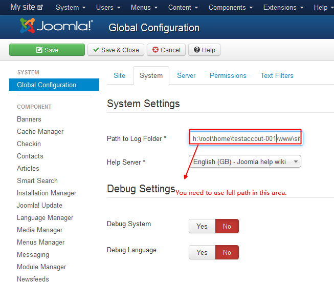 1. Use full path at admin panel >> System >> Global Configuration >> System Settings >> Path to Log folder;