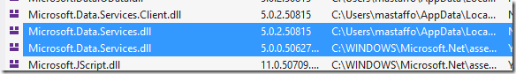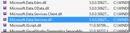 In this case we have two versions of Microsoft.Data.Services loaded. We pulled 5.0.2 from the bin deploy folder and we still have 5.0.0.50627 loaded from the GAC. Were you to bin deploy this application as-is, it would fail on the server with an error similar to the following: