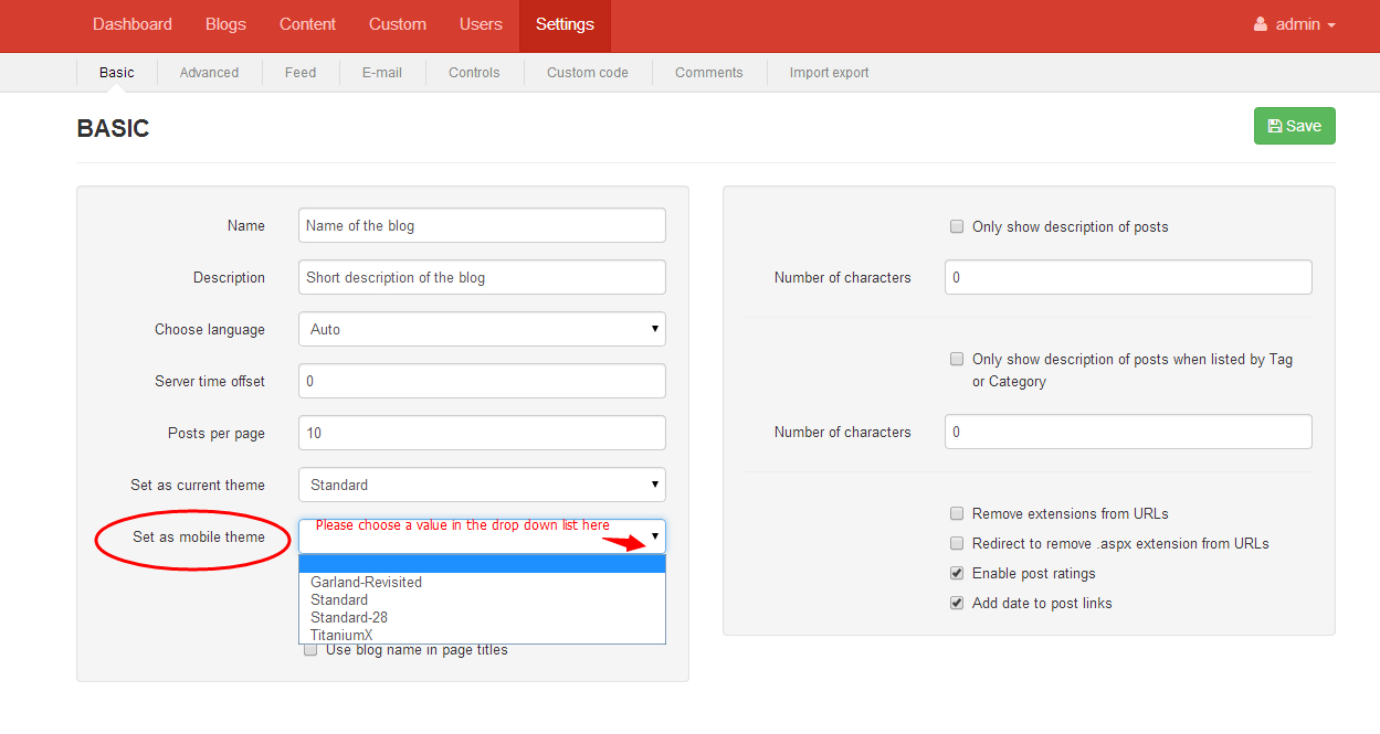 After installing blogengine you would need to login as admin to change the basic settings like the theme and title, however, if you press the Green Save Button but nothing happens and the data are not saved that is mostly because you let the mobile theme be blank.