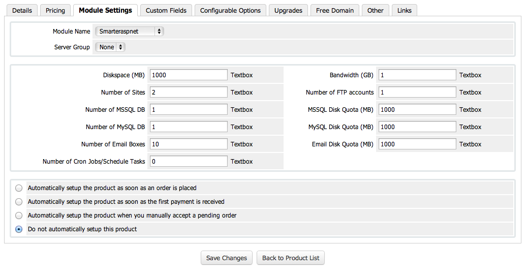 4) Now login to your WHMCS admin interface and go to your Product/Service section and configure each of your hosting plan.