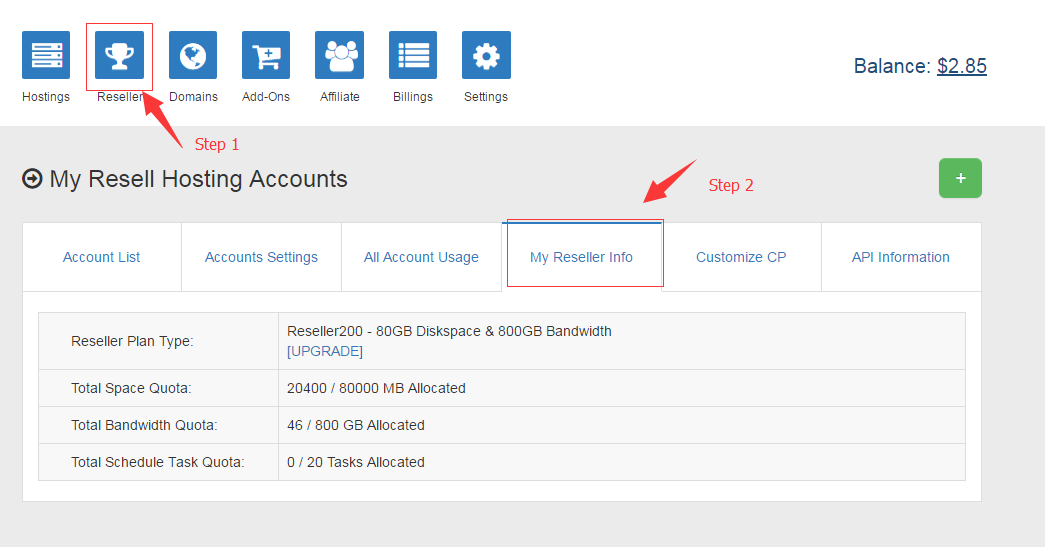 You can check your reseller plan type & total space quota & total bandwidth quota and total schedule task quota here.