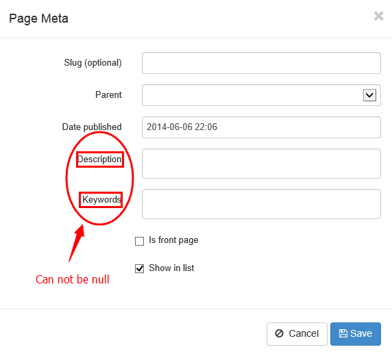 It is due to the configurations of content are incorrect. You can login with admin account and next to content >> pages >> add new page. In the "Settings" of the page, you need to have both Description and Keywords filled in.