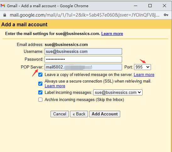 • Note that Gmail require secure connection, so we need to use SSL port. So we need to update POP3 port to 995 and specific the secure POP3 server address.
