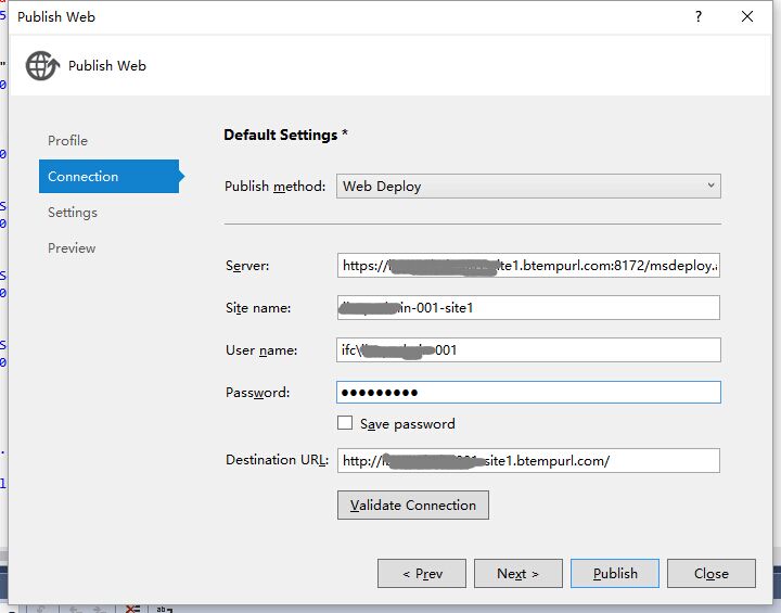 4. Fill your Web Deploy publish login information, validate the connection to check if it is ok, and remember to accept the certificate warning message.