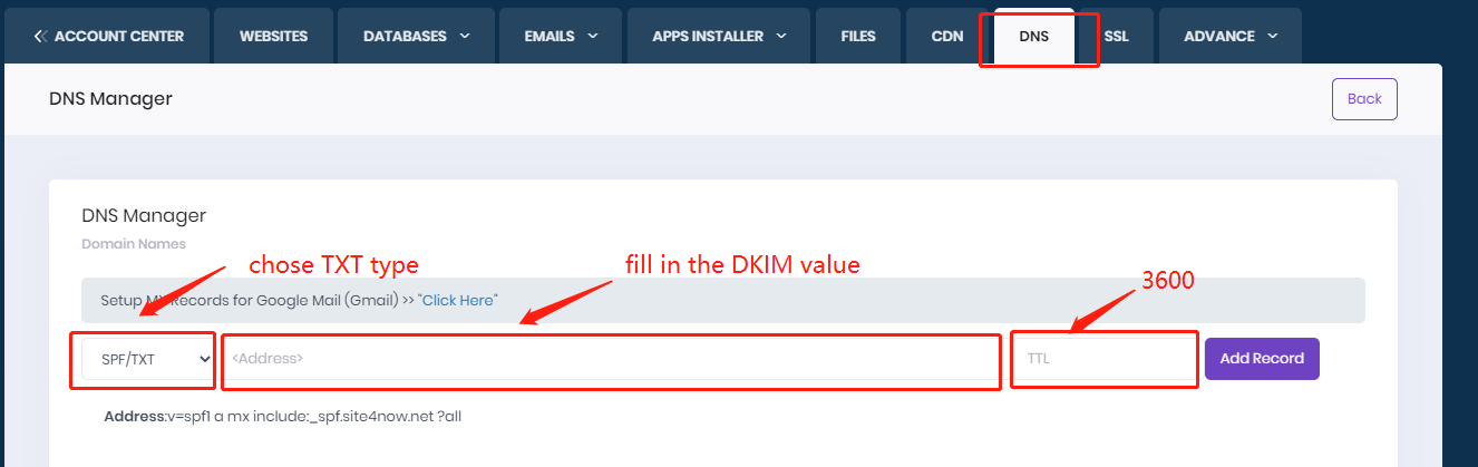2.Paste the TXT record you got from Smartermail web interface,click Submit button.