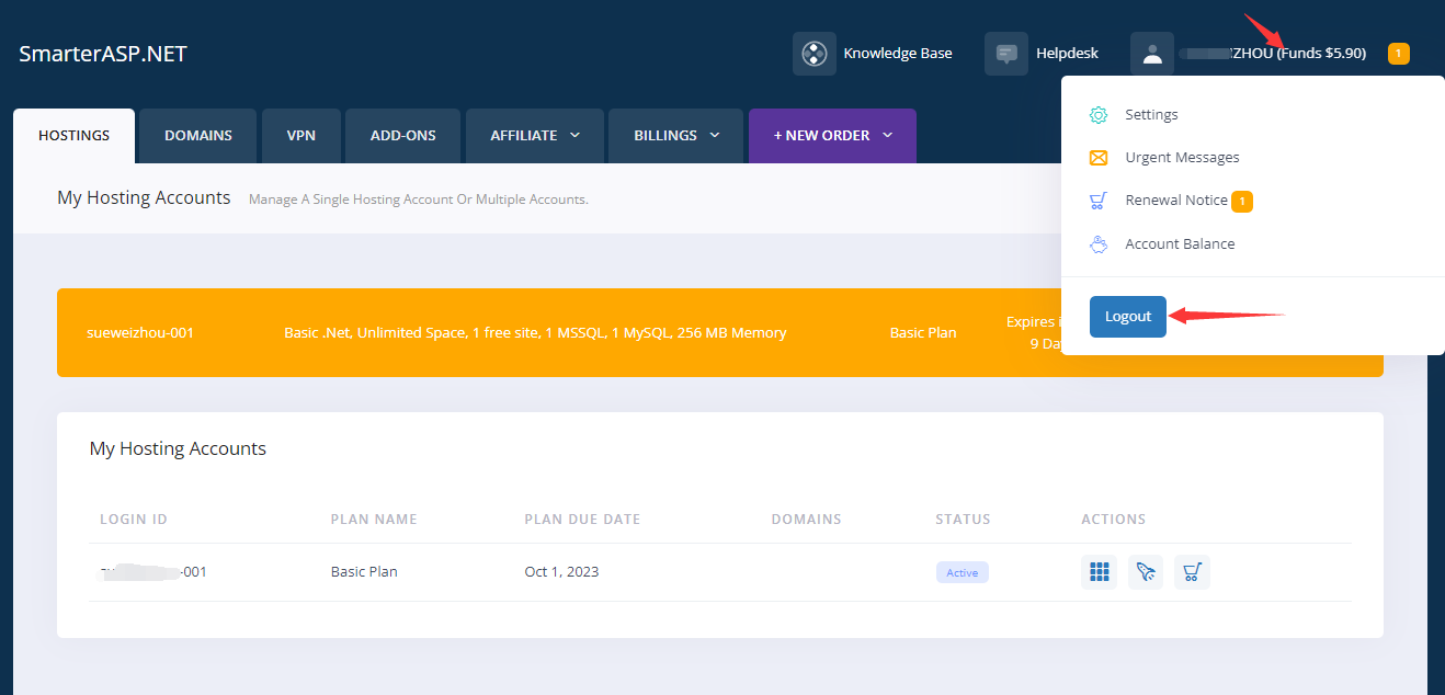 Click on your username of member account center or hosting control panel , and select logout will be fine.