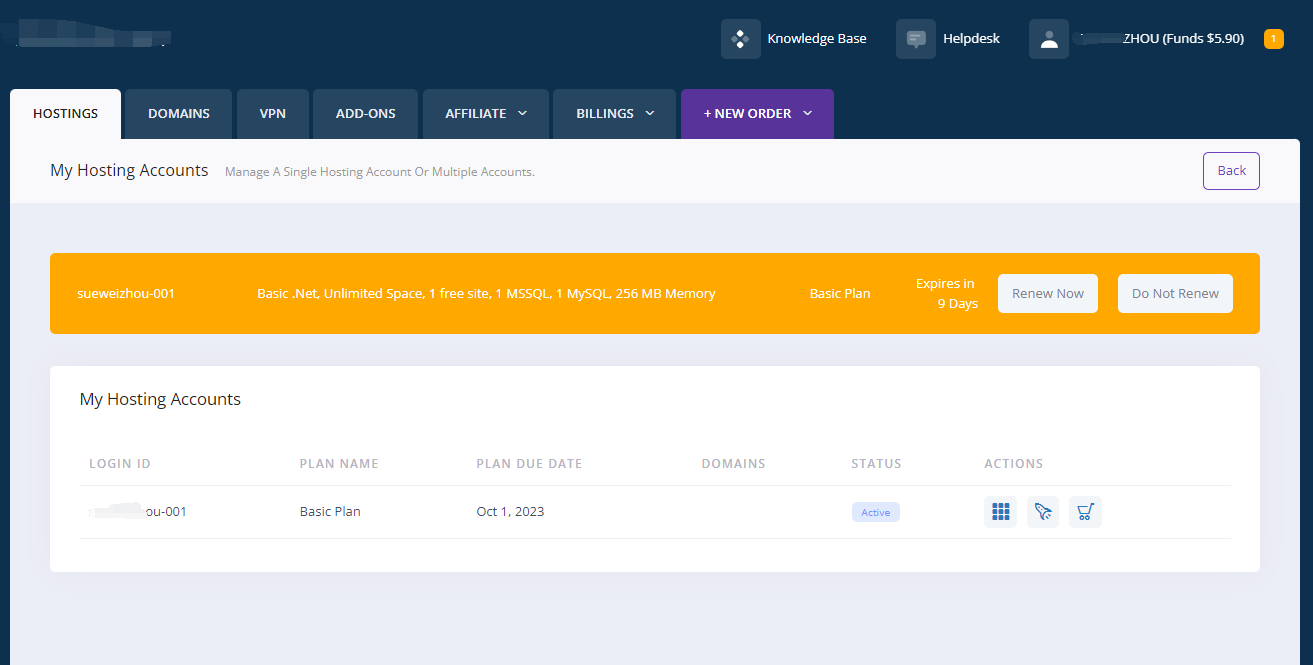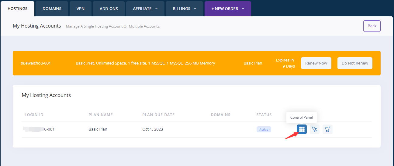 1.Once you login to member account center, you will see all hosting account list of your member account and click Control Panel to login to hosting control panel