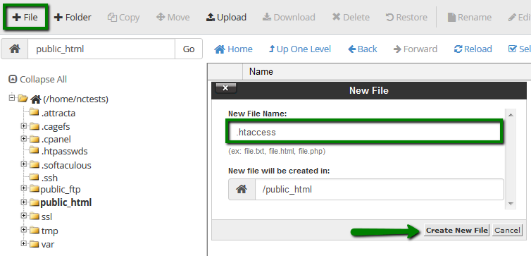 If there is still no .htaccess file in your File manager, feel free to create a new one using File option: