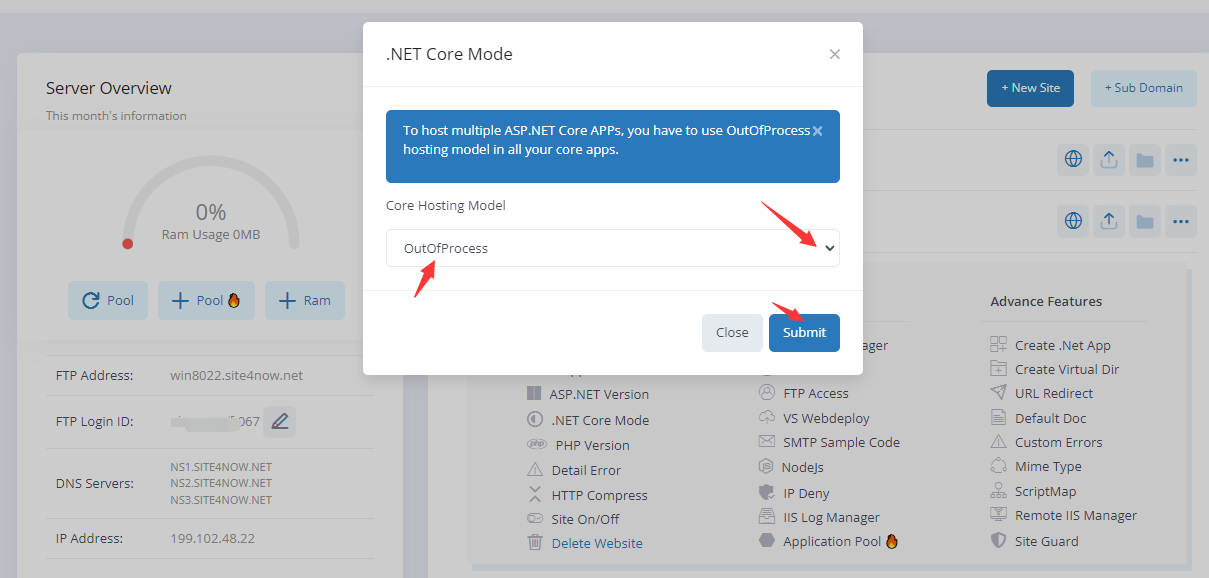 1) If you are with our .net basic or .net advance plan, we would suggest you to use ASP.NET core OutOfProcess mode, you can change hosting model from our Control Panel.