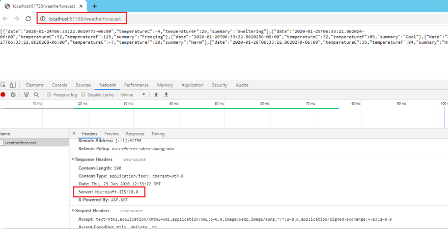 Run the application on *IISExpress * server then open the browsers network tab and check for the first call. Under the server section, you will able to see its showing Microsoft IIS.