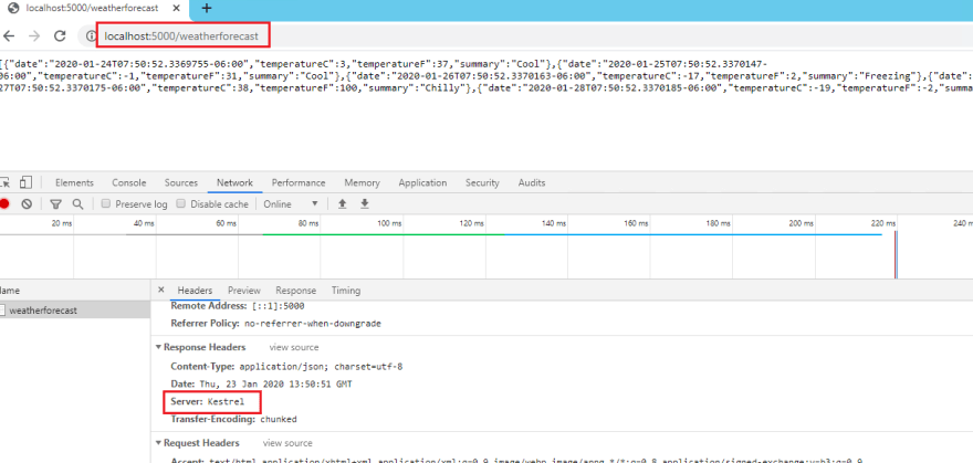 Browse the URL and open network tab and see the server attribute as Kestrel.