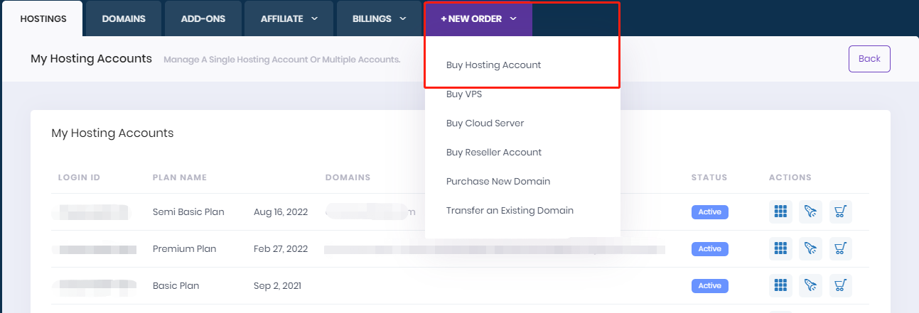 You can login to your Member account, click button "+NEW ORDER on the right to purchase additional hosting account, please check the below screenshot