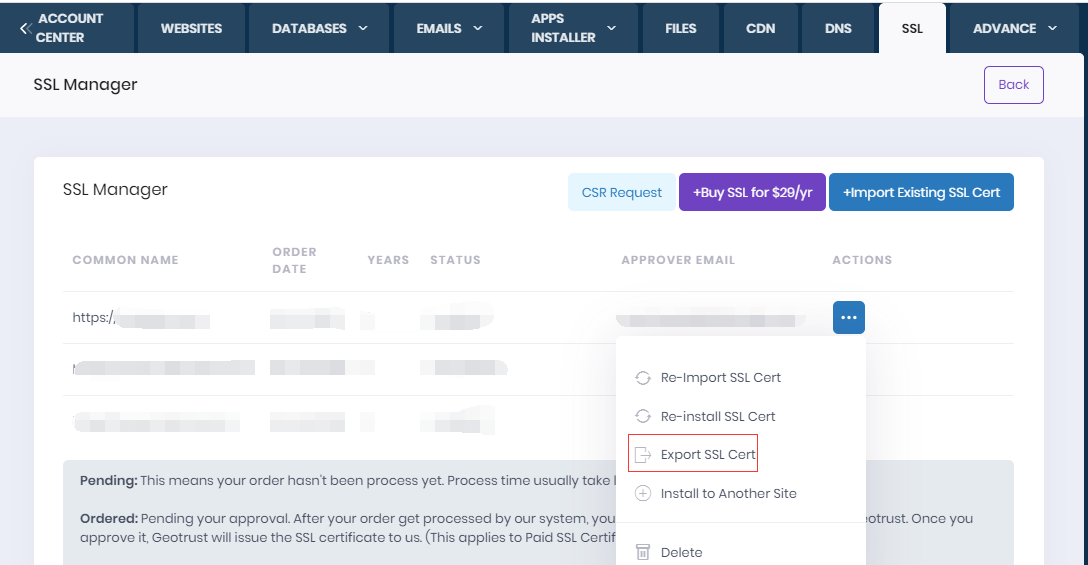 Please login to your hosting control panel-->SSL, click Actions icon beside your SSL certificate, then click "Export SSL Cert" link, then the SSL .pfx file would be saved into your db folder