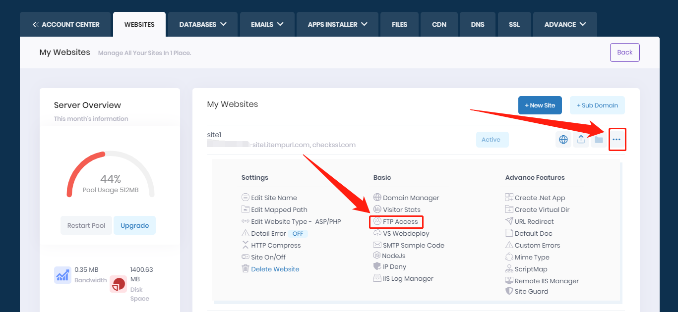 1. Login to hosting account control panel --> WEBSITES --> click "..." at the right of your site --> click "FTP Access" in "Basic".