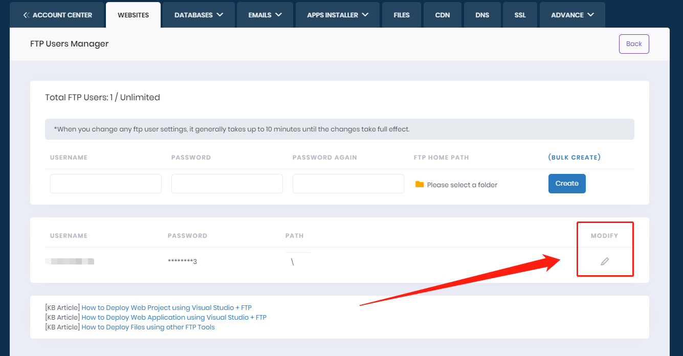 3. Choose the detail FTP account, click the pen icon under "MODIFY", then you will be able to change the FTP password.