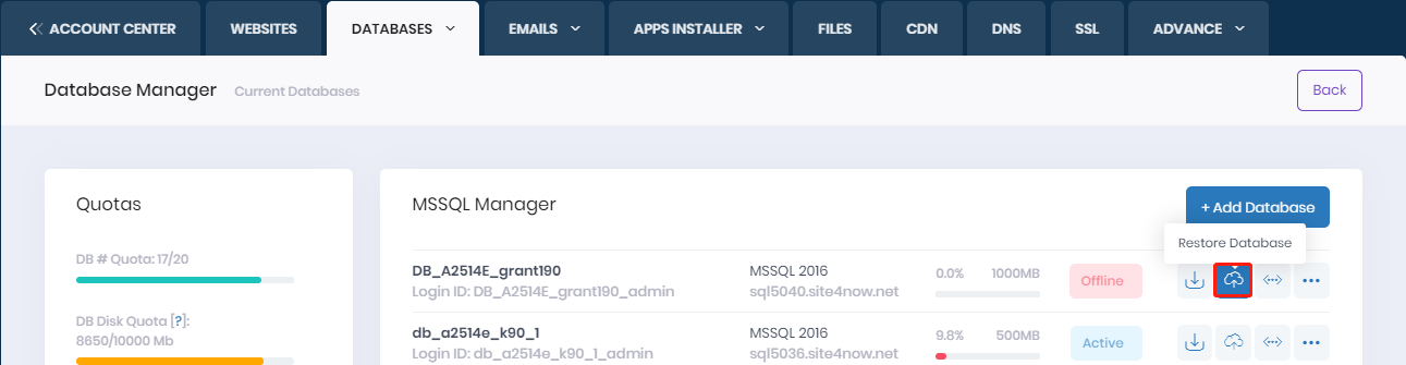 - Login to your hosting control panel-->DATABASES, to create a new mssql database, for more details, please click here