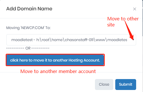 2. Once you click "Move" icon, you will see the options, please select which site you want to move the domain to and click "Submit" button.