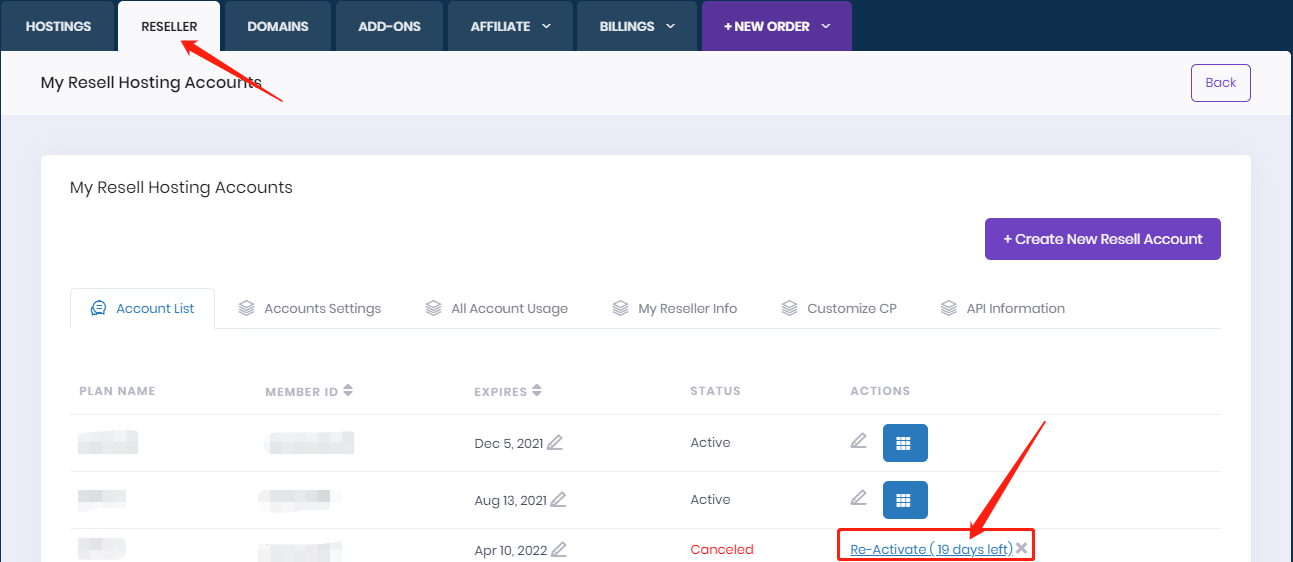 You can recover the deleted suspend resold account by login to your member account-->Click "RESELLER" from the top navigation, In the account list, please click the "Re-Activate" to recover the suspended resell account, please note that you can only reactivate it within 30 days