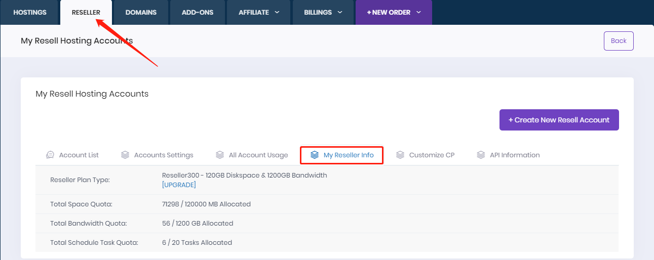 You can check your reseller plan type & total space quota & total bandwidth quota and total schedule task quota here.