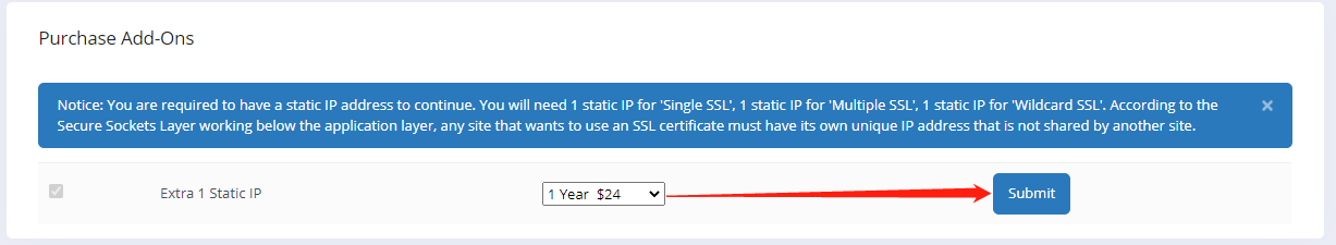 4. it will ask you to purchase a static IP if your hosting account does not include one