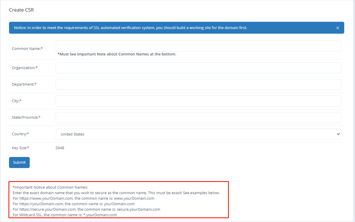 7. fill the CSR generation info, then click submit, the CSR will be generated automatically