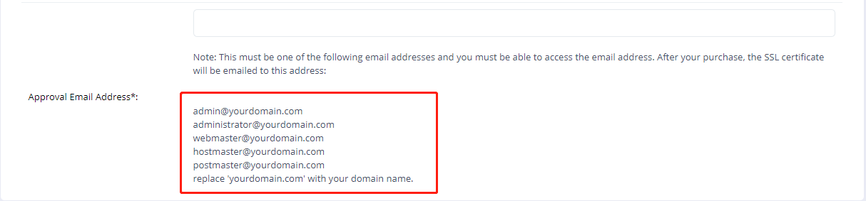 Note: For security reasons, an approval email can only be sent to any one of the generic @domainname.com email addresses, so if you do not have a valid mailbox for any of those email addresses, please set email forwarding(contact your domain registrar for support with this step).