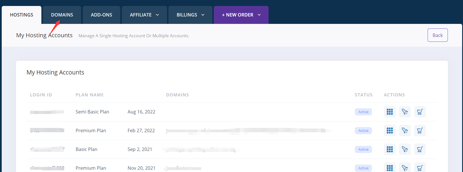 Please loging to your your control panel-->domain section, click Buy/Transfer Domain Names button. Choose Transfer an Existing Domain and type in the domain you would like to transfer and click Submit Transfer Request to start it.