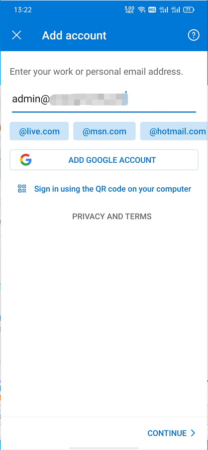 First, you will need to go to Andriod Google Play or other markets to download the Outlook APP. Then open your Outlook with your device. Click the ADD ACCOUNT button to add our email account.