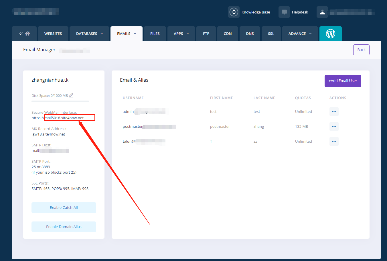 - IMAP Host Name: mail50XX.site4now.net:993 for SSL (you can get the specific email server from the below image with your hosting account>>Control Panel>>Emails, Different domains may have different email server names, you must enter the correct one that getting from your Control Panel. If the given server name does not work with SSL, please change it to the alternative server name - "replace 'site4now' with 'SharkASP.NET'")
