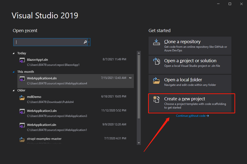1. Open your visual studio 2019 then click "Create a new project" option to create a new project.