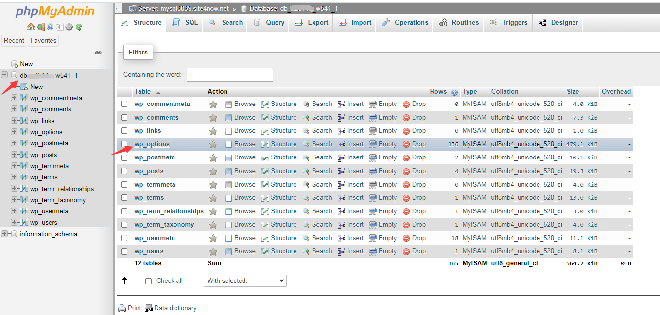 - Under the Table heading, click the wp_options table. A list of data rows appears.