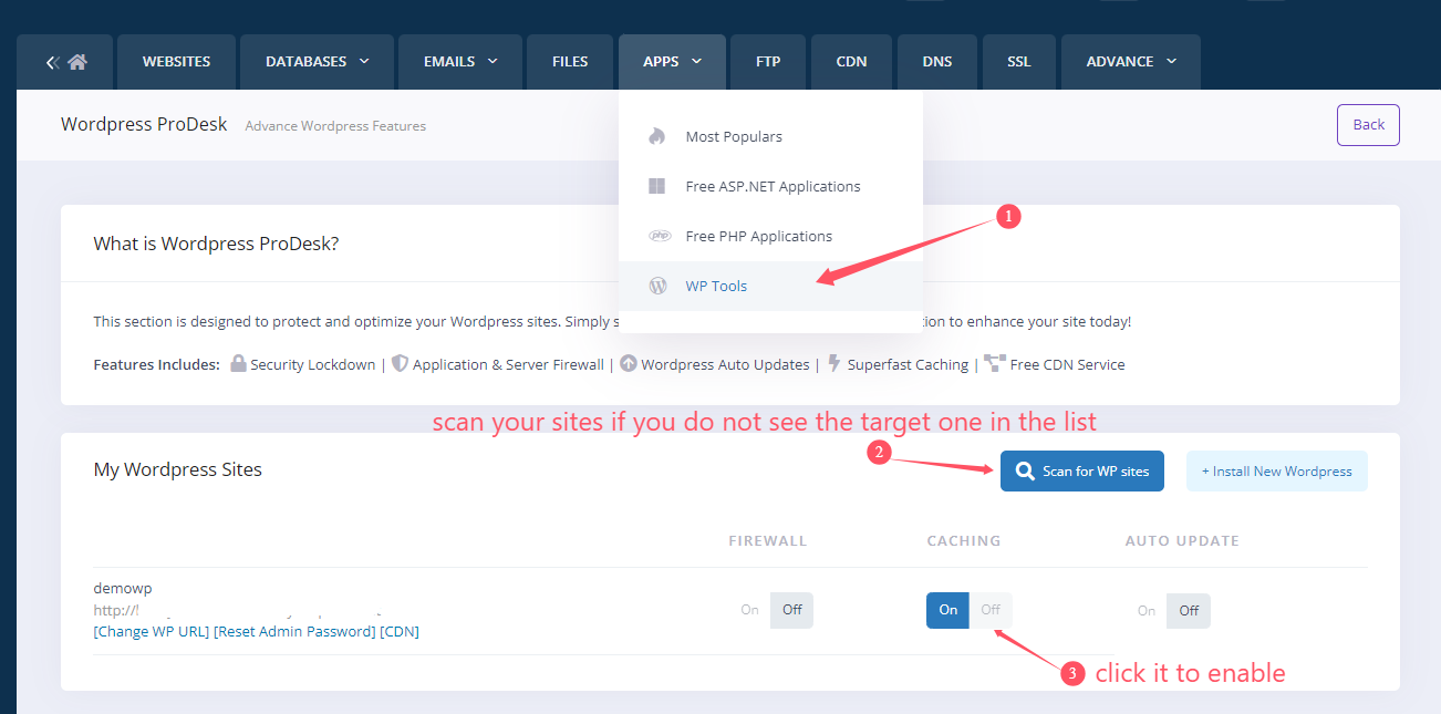 Please go to your Control Panel > WP ProDesk > run "Scan for WP sites", then select the destination site > enable Caching, this will install the "WP-Optimize - Clean, Compress, Cache" plugin to your WP site and enable it automatically.