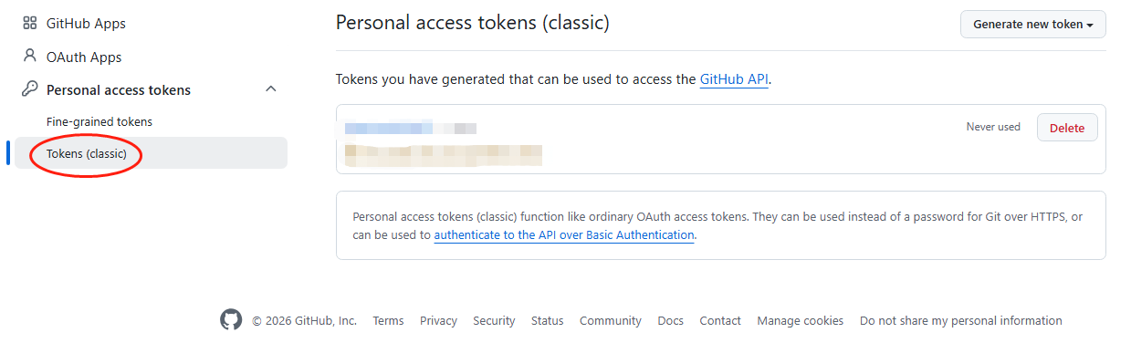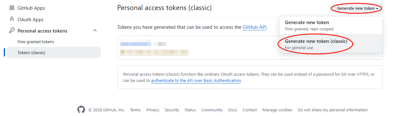 5. Click Generate new token on top right menu and select Generate new token (Classic).
