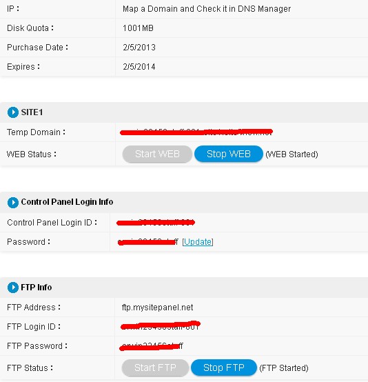 3. You can check the site purchased date, expiration date, temp url, control panel and FTP login info, and you can manage the site and ftp account status here.