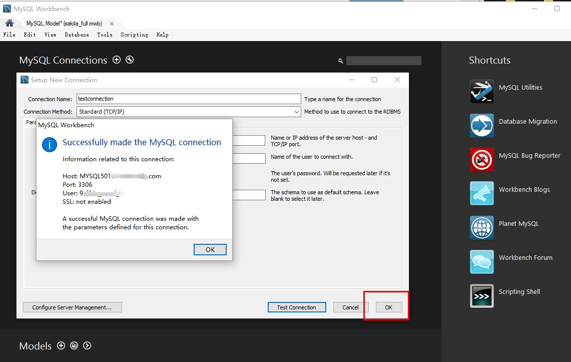 2.Enter your own Connection Name and the fill in Mysql connection info, click Test Connection button to check.