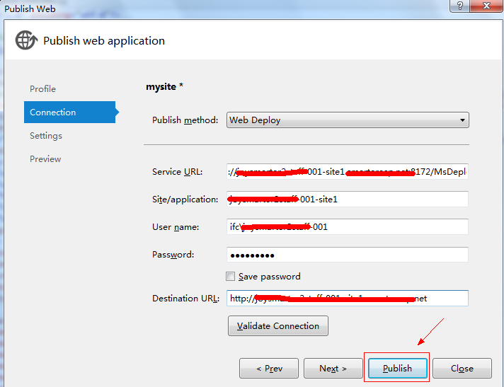 5. Fill your Web Deploy publish login information, validate the connection to check if it is ok, and remember to accept the certificate warnning message.