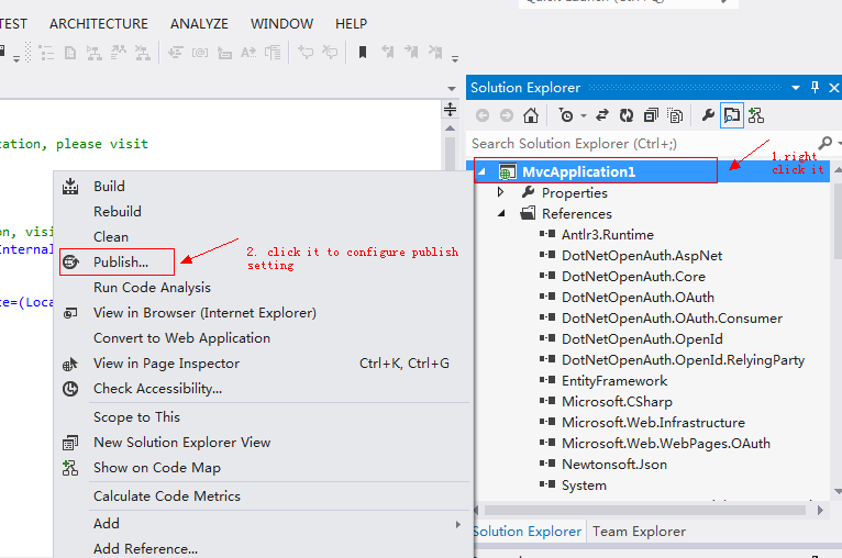 2. Open your web application with Visual Studio 2012, right click the web application, then click "Publish" to start.